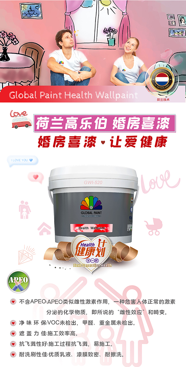 高樂伯婚房喜漆采用先進的環保科技乳液配方,嚴選優質原材料,不含APEO(壬基酚聚氧乙烯醚,這是一種已被證實會影響動物和人體生殖系統的助劑)。為愛妻人士提供一款全方位的婚房用愛漆,特別適合新婚家庭,打造一個安全無憂的居住環境,為孕婦和小寶貝的健康保駕護航。