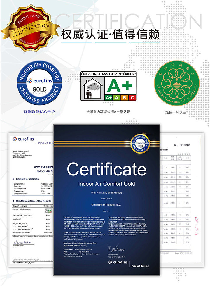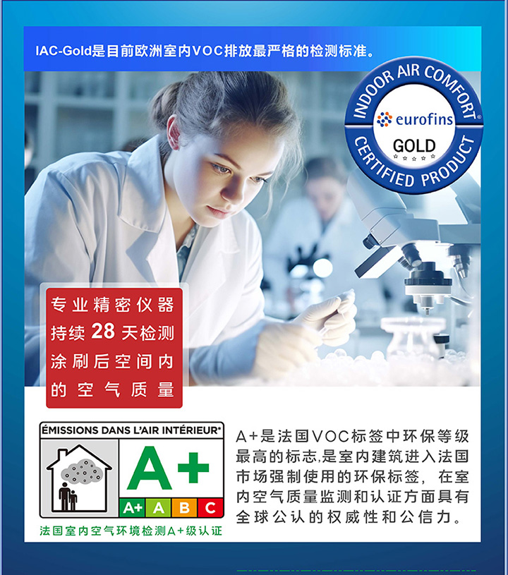 源自荷蘭,秉承歐洲綠色理念,通過嚴苛的歐陸IAC-GOLD金級認證及法國A+級認證,確保產品安全可靠,裝修無憂。