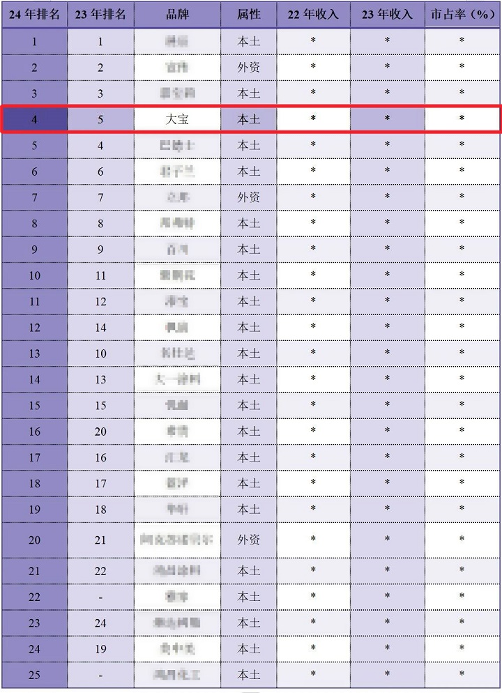10月10日,國內(nèi)權(quán)威涂料工業(yè)財經(jīng)媒體《涂界》(Coatings World)發(fā)布了“2024中國家具漆品牌TOP 25”排行榜,匯集了國內(nèi)最具影響力的家具漆品牌。大寶漆憑借卓越的市場表現(xiàn)榮登第4名,較去年上升一位,連續(xù)多年穩(wěn)居家具漆行業(yè)頭部品牌之列,展現(xiàn)了其強大的品牌實力與行業(yè)領(lǐng)導(dǎo)地位。(數(shù)據(jù)來源:https://mp.weixin.qq.com/s/s_wiCGDU7ofTQnuvKh0n2Q)