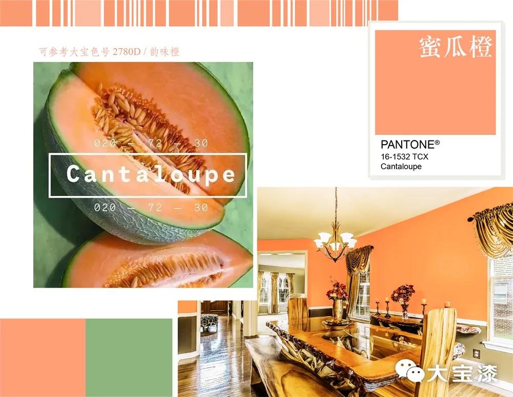 蜜瓜橙是WGSN公布的2020春夏五大關鍵色之一,蜜瓜橙帶著幾分粉色調,比激光橙要柔和許多,同時又帶著滿滿的活力,更受年輕群體青睞。