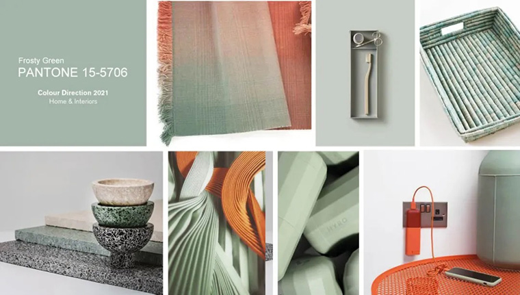 人們越來越關注產品材料的可持續性,素食主義和植物性材料的崛起,柔和的中性灰綠色喚起了人們對健康家庭和有意識的消費主義的渴望,搭配濃郁的焦糖和棕褐色,柔和的陰影營造出復古氣息。