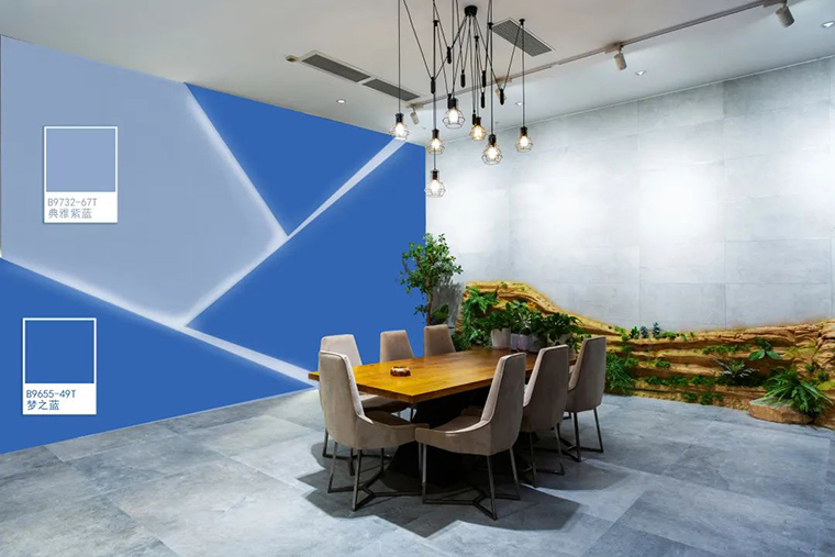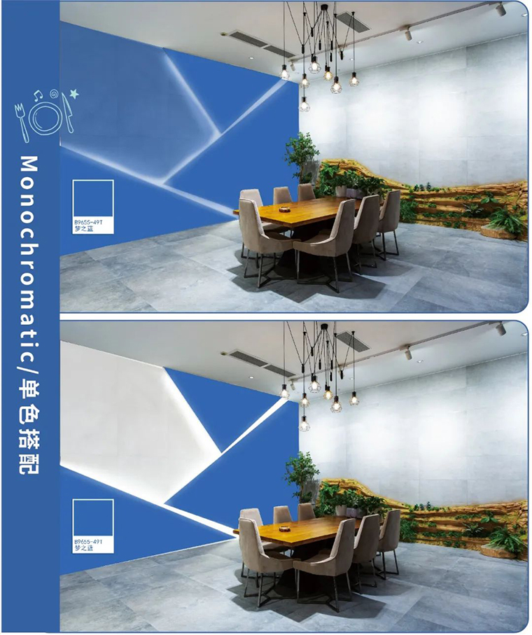 因?yàn)樗{(lán)色讓人明顯降低食欲。Pantone色彩研究所Leatrice Eiseman說(shuō)過(guò):藍(lán)色可以很好地表現(xiàn)出恒定和信任感,也能呈現(xiàn)出時(shí)髦的現(xiàn)代風(fēng)格。所以今天大寶色彩研發(fā)團(tuán)隊(duì)將通過(guò)夢(mèng)之藍(lán)B9655-49D色系搭配,在餐廳中使用藍(lán)色,擺脫「藍(lán)色魔咒」!